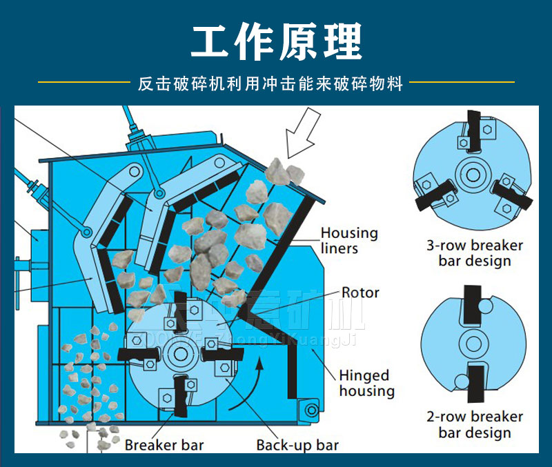 反擊破碎機經過三角帶傳動帶動轉子高速運轉,物料自入料口進入破碎腔內,被高速旋轉的錘頭打擊,沖擊渦旋破碎,未被充分破碎的大塊物料,在P破碎腔部的厚反擊板與錘頭作用下產生大的壓力與彎曲力,即使很難破碎的物料也能輕易被粗碎后進入下段S破碎腔和T段破碎腔,物料在此二破碎腔內受到摩擦、擠壓、沖擊、折斷、而得到中、細碎后排除機體。