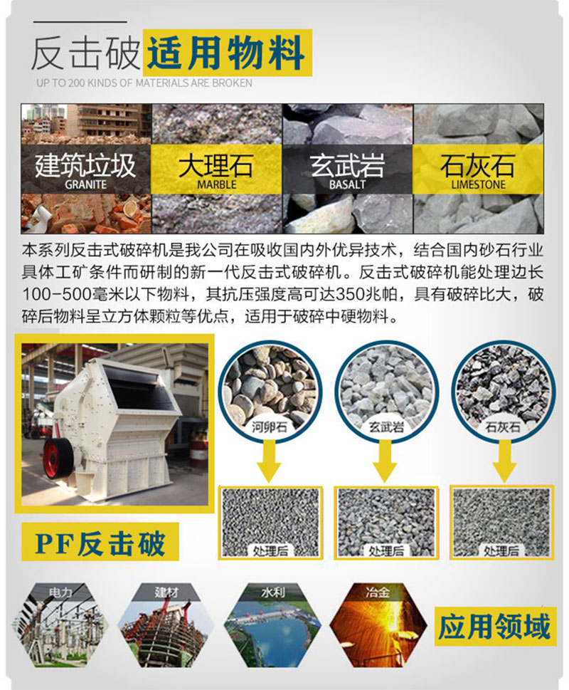 產品型號:PF-1007 PF-1010 ...適用物料:邊長100~500毫米以下物料、抗壓強度小于350兆帕應用范圍:用于建材、礦山、冶金、等眾多行業,適用于破碎石灰石、硫化鐵礦石、煤等中硬度以下的脆性物料。