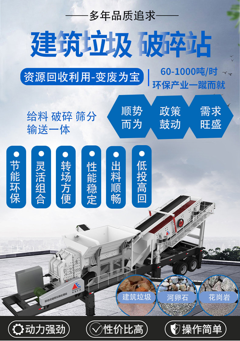 鄭州中意礦山機械有限公司曾研制國內的建筑垃圾處理設備YPC移動式破碎篩分站,其長度十多米,建筑垃圾回收利用率達95%,它的出現改變了用鄂破和反擊破來破碎建筑垃圾的傳統方式,對鋼筋和混凝土分離徹底,關鍵的是設備的除塵降噪音裝置,讓整個建筑垃圾回收再利用過程無揚塵、無噪音,真正的綠色安全設備。